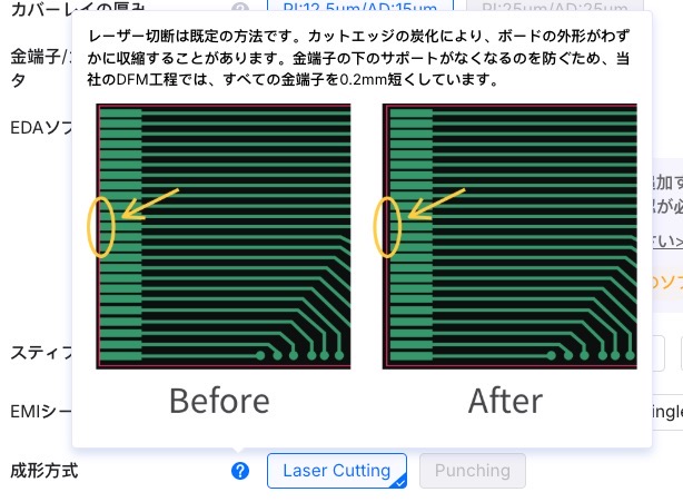 JLCPCBの発注画面でカット方法を見るとレーザー切断が既定の方法となっているようで、パッド下のサポートがなくなるのを防ぐために、0.2mm全ての端子を短くするといったことが記載されています。