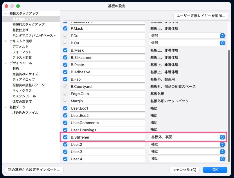 KiCadには標準でスティフナー専用レイヤーは用意されていないため、新たにレイヤーを追加しました。