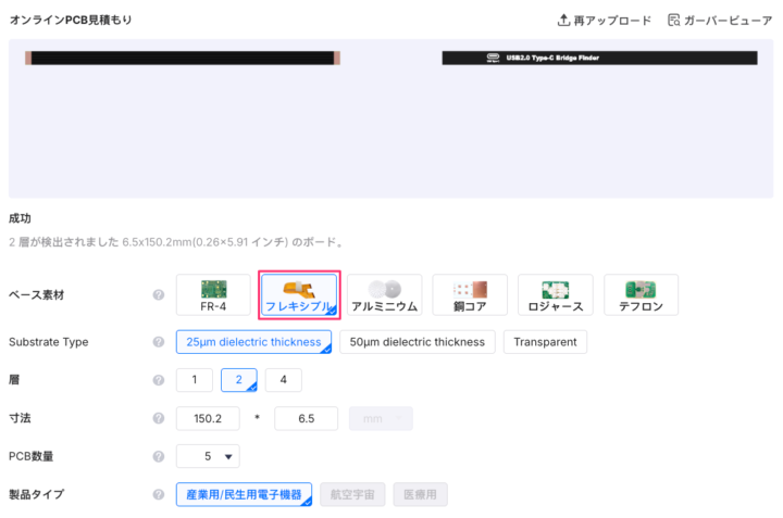 ガーバーファイルをアップロードし、ベース素材に[フレキシブル]を選択します。