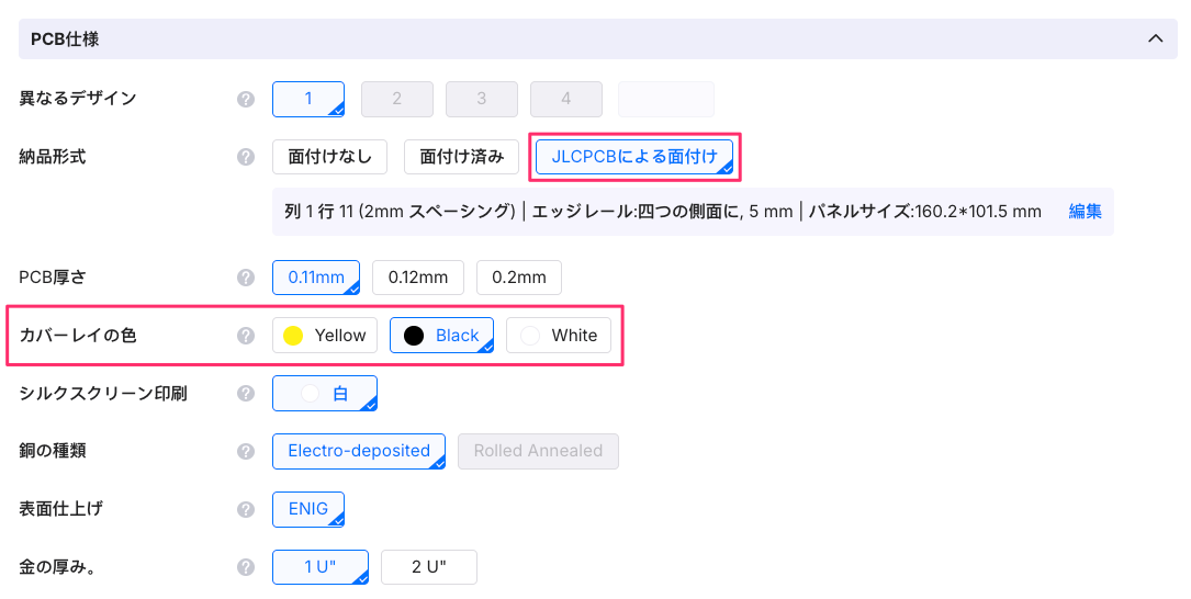 JLCPCBのFPC基板の製造では、カバーレイ(FR-4基板で使われるソルダーレジストに相当する保護層)として、従来の黄色だけでなく、最近ではブラックやホワイトも選択出来るようになっています。