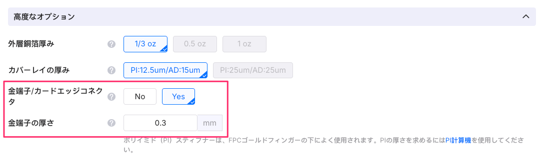 端子部はエッジコネクタ扱いとなるので、[金端子/カードエッジコネクタ]に[Yes]を選択。