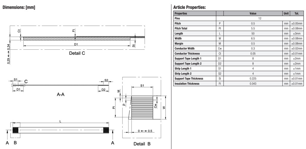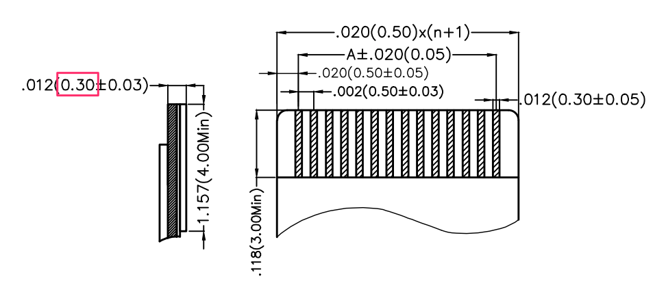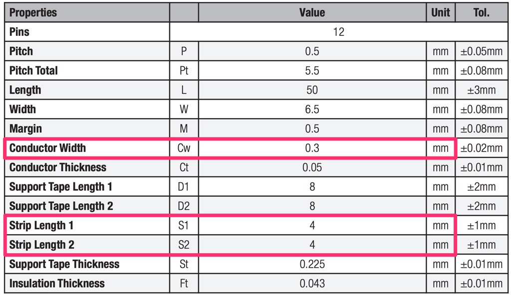 一般的な12ピン0.5mmピッチのFFCフラットケーブルでは、端子寸法はおおよそ以下のようになっています。(画像引用)