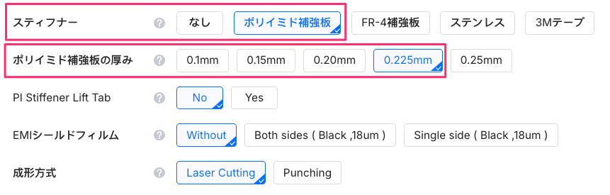 そして、スティフナーは、[厚み0.225mmのポリイミド補強板]を選択しました。