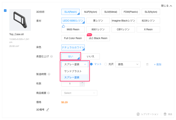 マテリアルに[LEDO6060 Resin]または[9600 Resin]を選択し[表面仕上げ]は[はい]を選択すると、通常のサンディング処理[サンドブラスト]または[スプレー塗装]の選択が出来ます。
