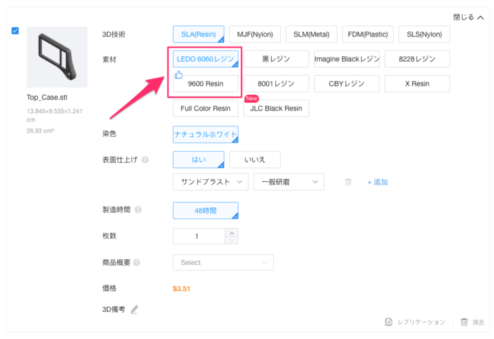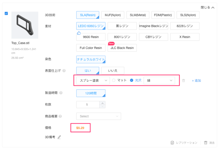 2024年9月現在、スプレー塗装サービスは[SLA(Resin)]の[LEDO6060 Resin]または[9600 Resin]の2種マテリアル(材料)のみ対応しています。