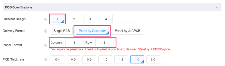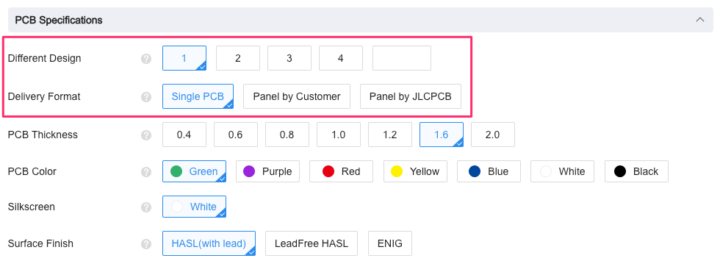通常発注する場合[Delivery Format]は[Single PCB]を選択しますが、[Panel by Customer]と[Panel by JLCPCB]という面付けオプションが用意されています。(追加料金がかかります)