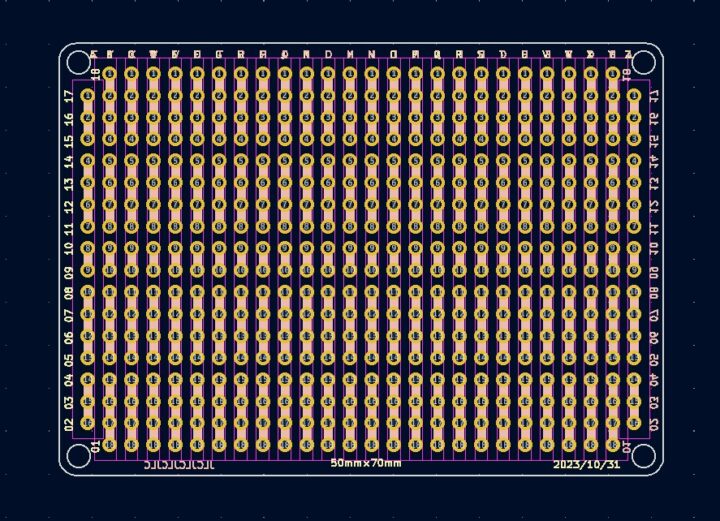 このような自作ユニバーサル基板の面付けを例に見ていきます。