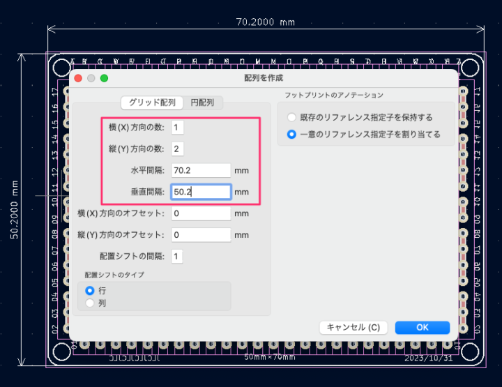 そして正確な間隔で配置していく必要があるので、先程計測した基板サイズも入力します。