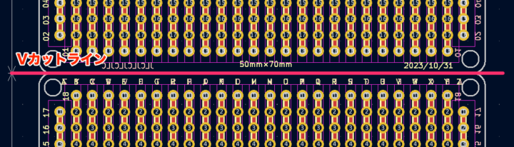 この基板では、基板同士が重なった真ん中のラインにVカット加工の指示を入れ発注する形となります。