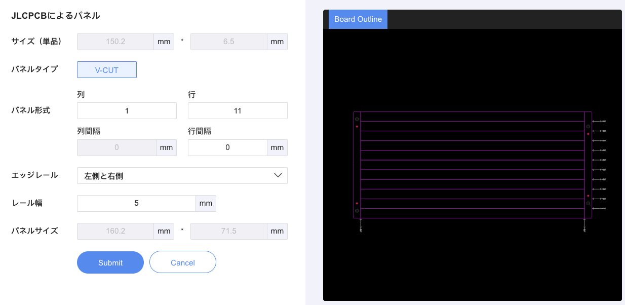 パネル化には1辺の長さが最低70mm以上必要となるため、これまでの通常基板と同じ感覚でこのようにサイズ指定を行い発注しました。