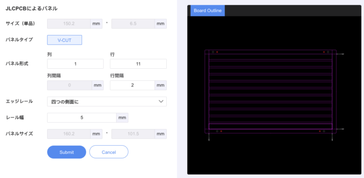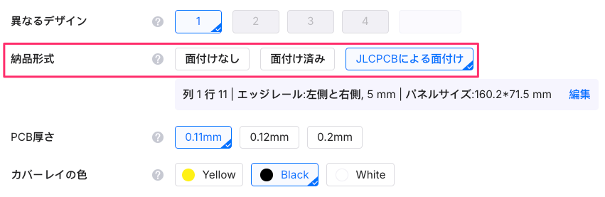 今回の発注では、形状がシンプルな同種面付けだったため、JLCPCBに面付けを依頼しました。
