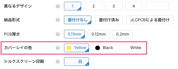 JLCPCBのFPC基板製造では、カバーレイ(FR-4基板で使われるソルダーレジストに相当する保護層)の色として、一般的な黄色だけでなく、黒やホワイトを選択することもできます。