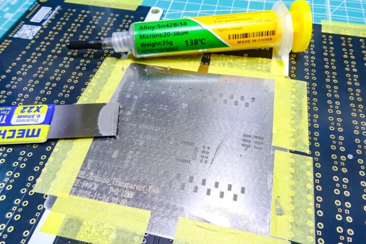 そのため、透明FPC基板では低温はんだペーストの使用が事実上必須となります。(今回138℃の低温ペーストを使いました)