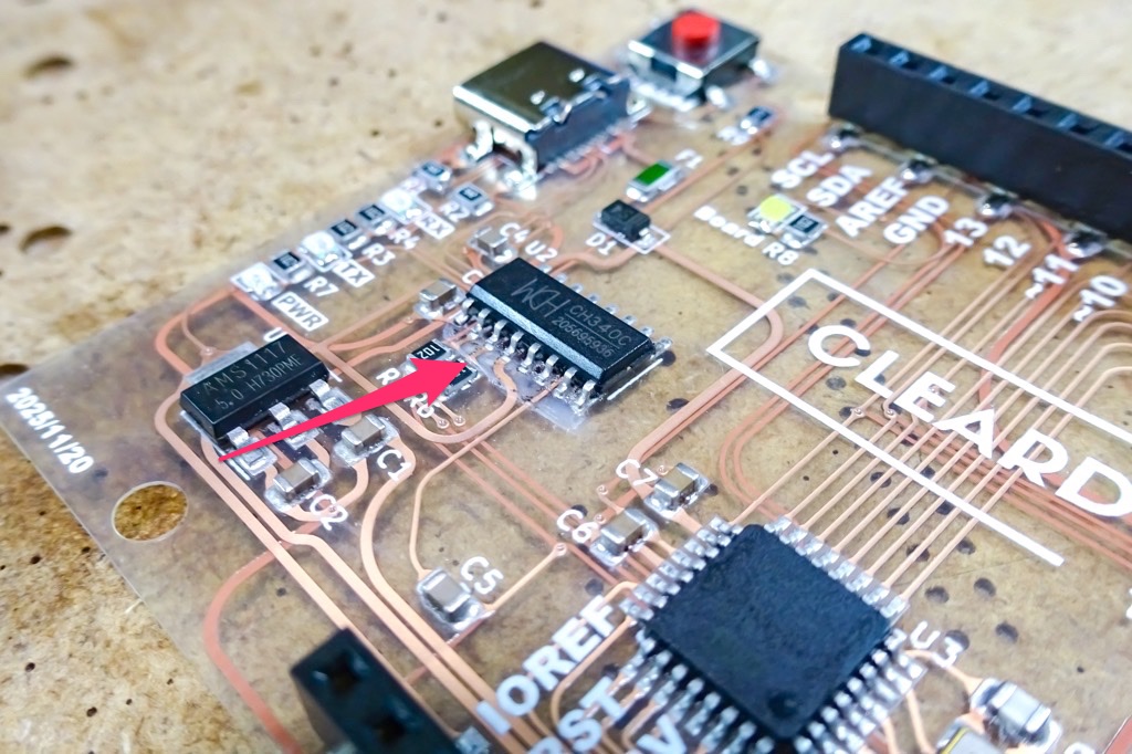 今回はあくまでテスト目的で発注した基板ということもあり、できるだけ実装難易度を下げるために回路構成は最小限とし、ICチップはリードがあり位置合わせ等しやすいQFPパッケージ、また抵抗やコンデンサは扱いやすい0805サイズといったように、部品選定にも配慮したのですが・・・