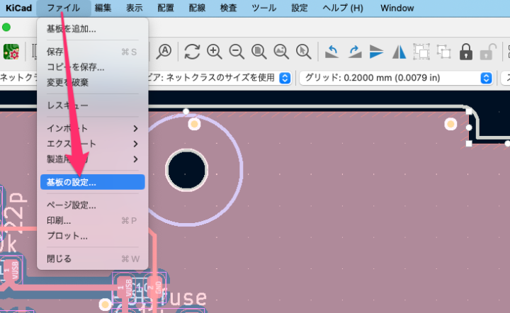 [ファイル]から[基板の設定]を開きます。[制約]の中にある[導体から基板端クリアランス]が今回設定したい項目となります。