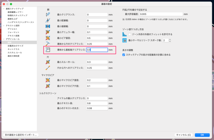 ゾーンの塗りつぶし領域と基板外形線とのクリアランスを設定する方法!