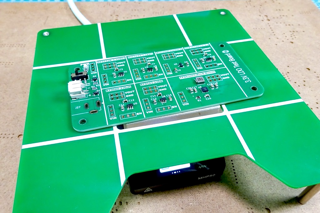 独立した7つのLDOチップの個別回路を1枚のボードにまとめ、電源供給回路と接続してテストが行えるといった構成となっています。