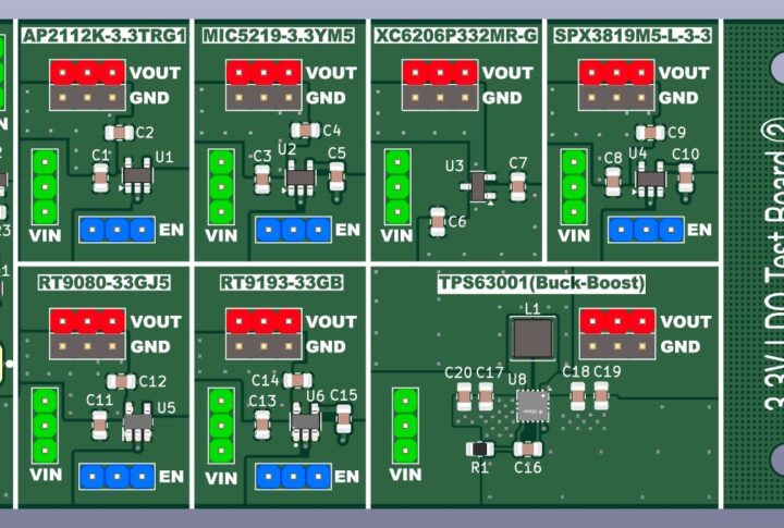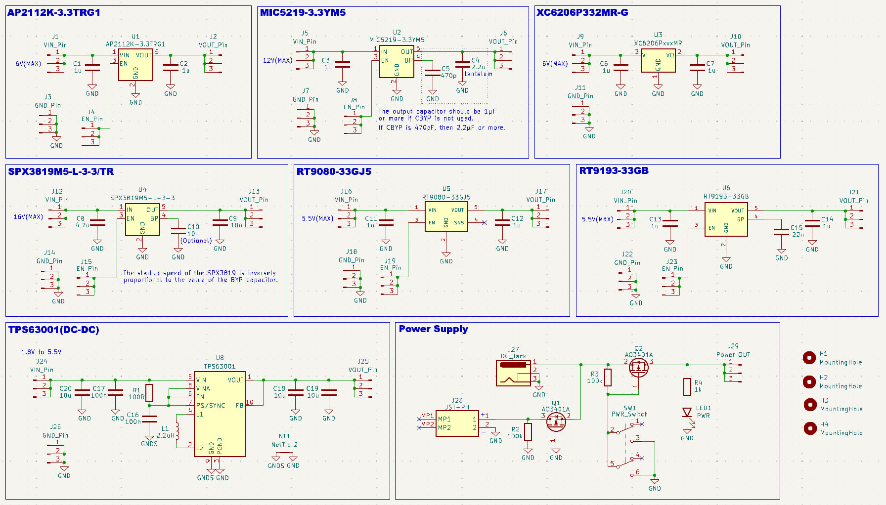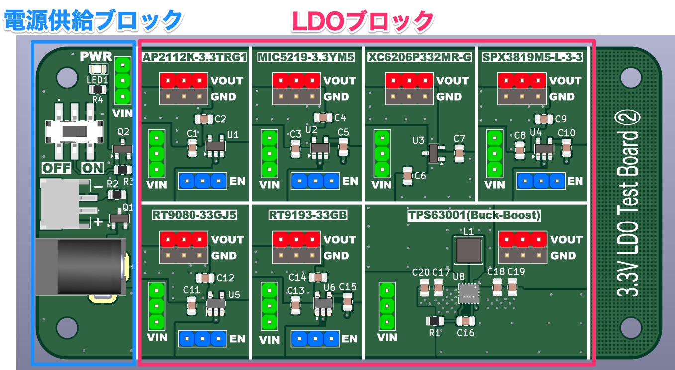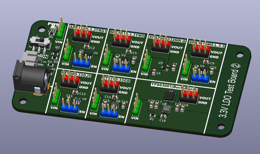 今回製作したテストボードは、出力電圧が3.3VのLDOチップをいくつかまとめたものとなります。