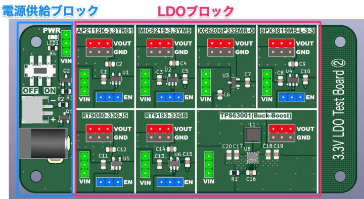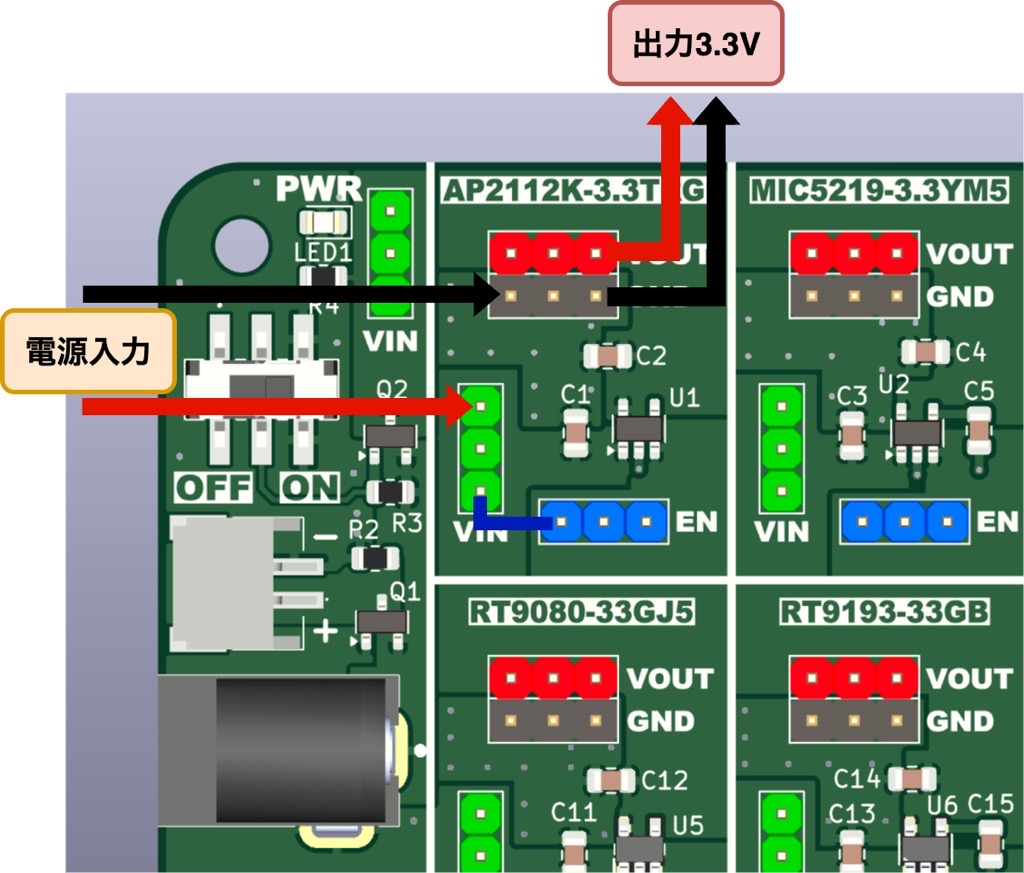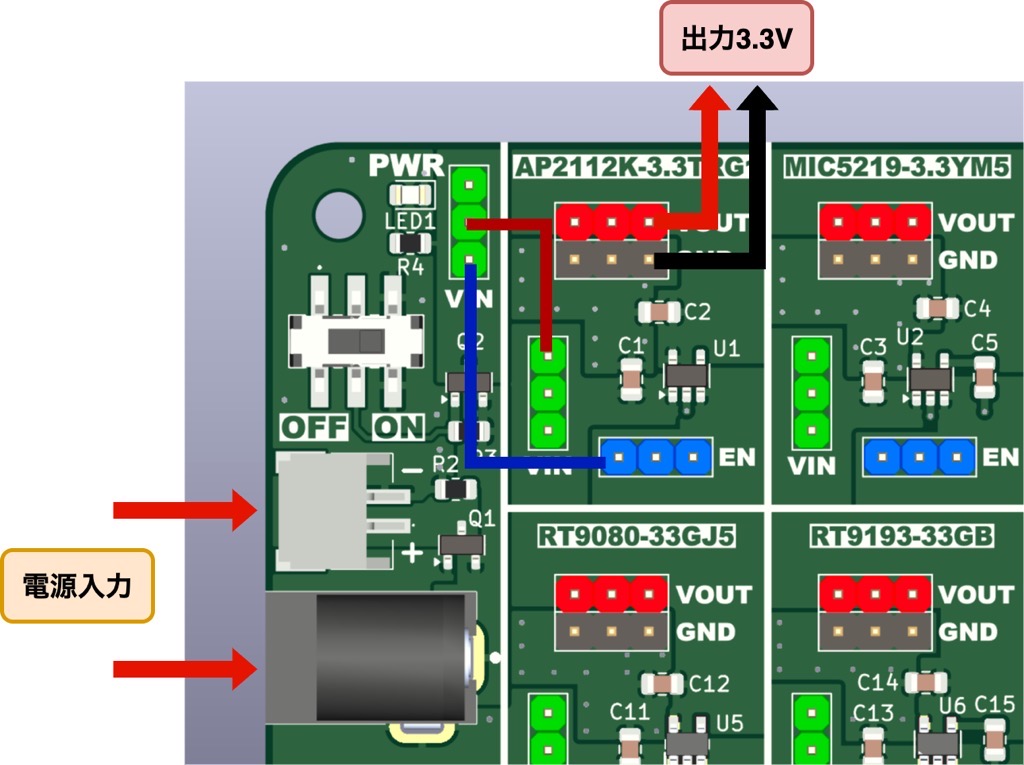 DCジャックまたはJSTコネクタに入力電圧を印加し、各LDOブロックのVIN端子にワイヤーを接続して出力電圧(3.3V)を外部のテスト回路等に配線する形となります。