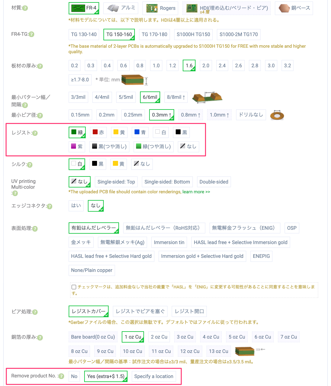発注項目の選択は特記すべきところはなくデフォルトで選択されている項目から変更する必要はありませんが、[Remove product No.]に[Yes(extra+$1.5)]を選択し基板製造時に入る製造番号を削除するオプションを今回付けました。