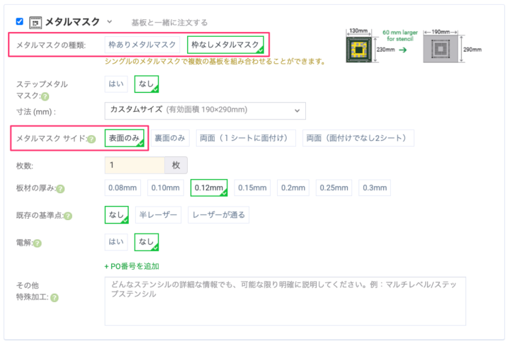 手実装となるので[枠なしメタルマスク]を選択、そして実装面は[表面のみ]の指定となります。