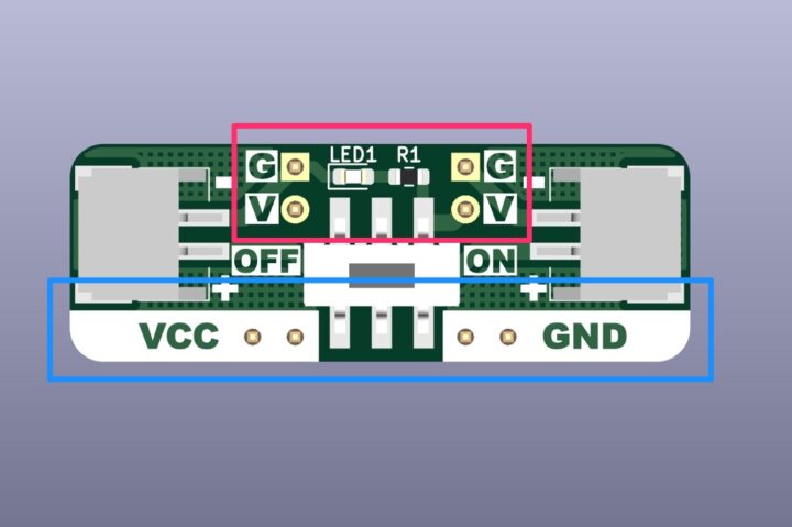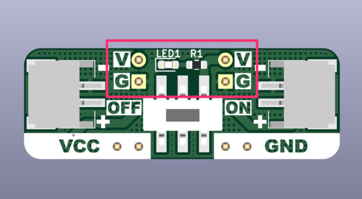 今回のV1.1ボードではこれを逆にして、上をVCC、下をGNDとなるように配置を変更しています。