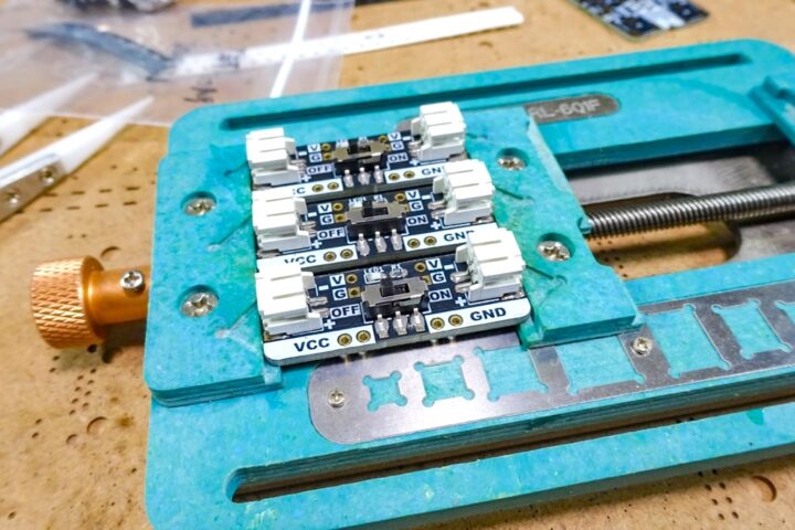 基板は5枚製造されるので、ピンヘッダー取り付け位置を変えこのように3パターン作っておけば、いろんな使用用途に対応出来ると思います。