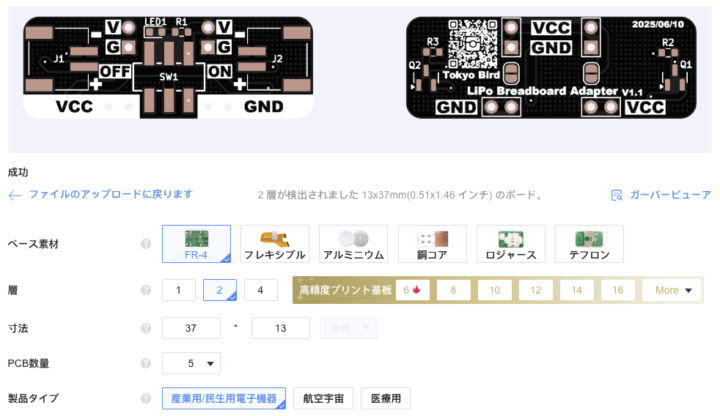 37mm×13mmと小さな基板サイズとなるので、JLCPCBなら送料を入れてもワンコイン程度で製造してもらうことが出来ます。