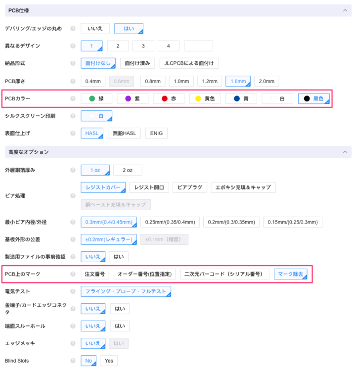 JLCPCBに発注する場合の選択項目も簡単に見ておきます。