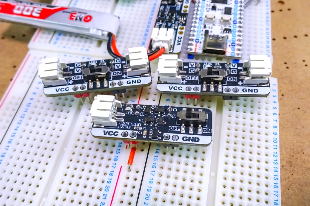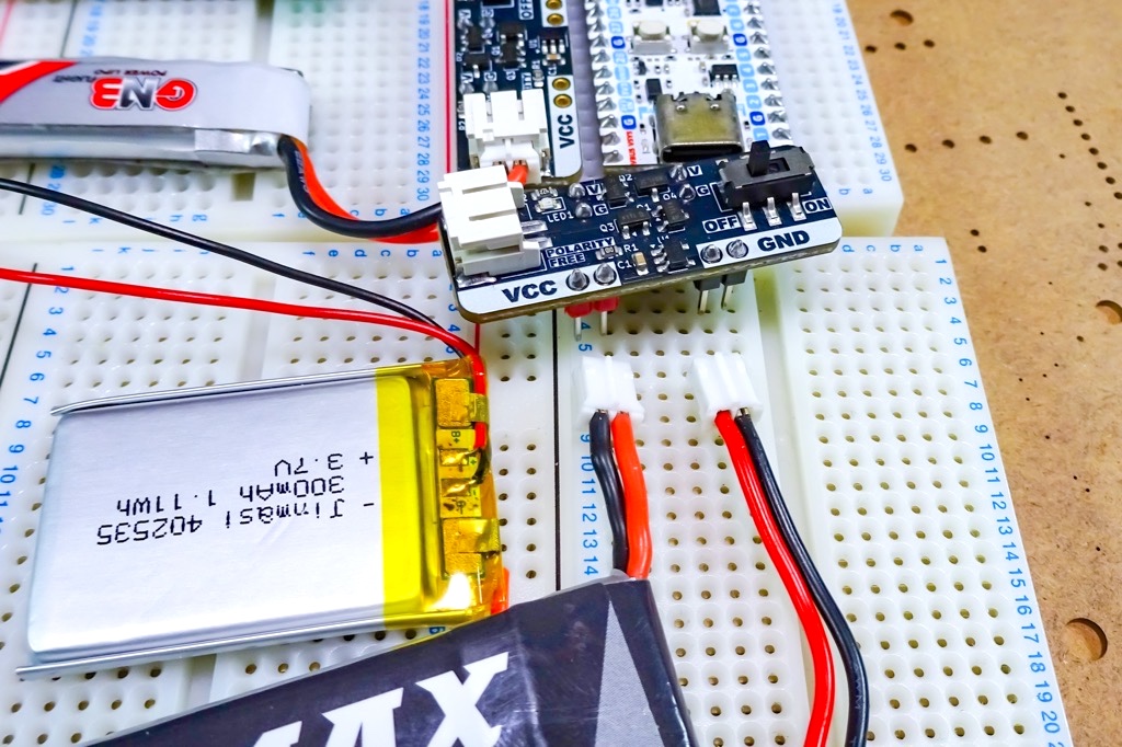 また、短絡や過電流、負荷側からの逆流といったトラブルに対する保護回路も追加したことで、リポバッテリーを使ったブレッドボード上での試作をより気軽に行えるようにもなりました。