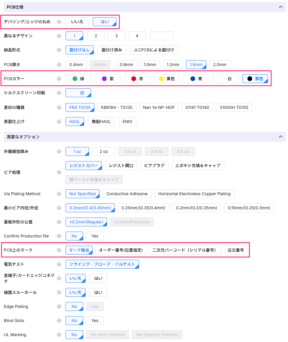ガーバーファイルをJLCPCBのサイトにアップロード後、製造項目を選択します。