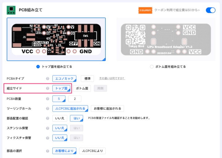 PCBAサービスを利用する場合は、[PCB組み立て]から製造項目を選択していきます。