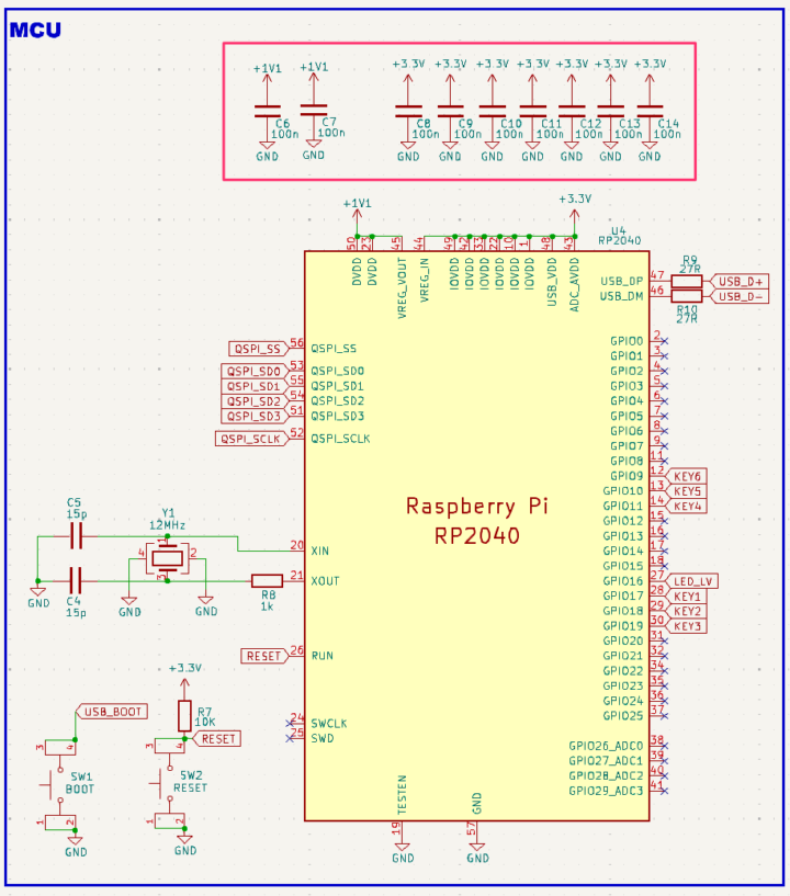 以上が最もベーシックなRP2040を使ったキーボードの回路構成になるかと思います。
