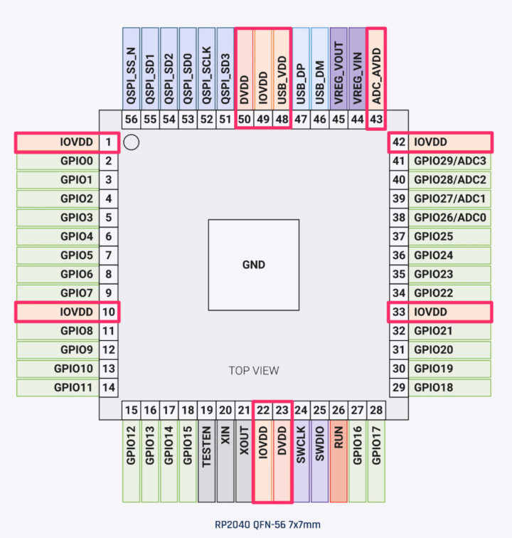 RP2040はデュアルコアを搭載し内部バスも高速なので、高速クロック動作でのノイズ等の発生を抑えるために多くのバイパスコンデンサ(デカップリングコンデンサ)が必須となります。