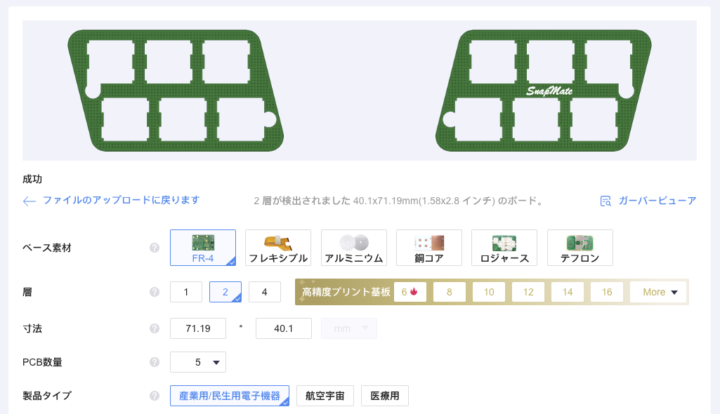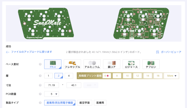 このサイズの基板であれば面付けしても料金的にほぼ変わらないので、メイン基板とキープレートは個別基板としています。