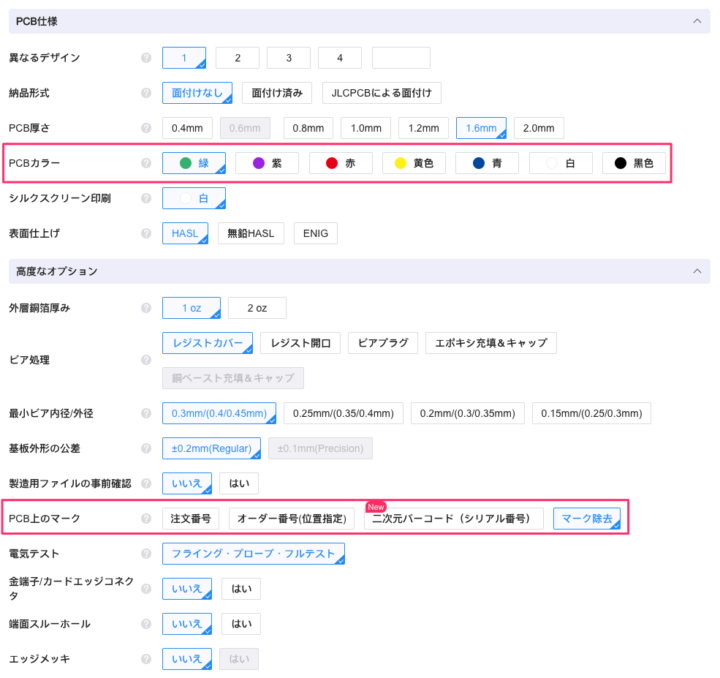 JLCPCBに発注する際の選択項目は特記すべきところはありませんが、余計なシルク文字がプリントされるのを避けるために[PCB上のマーク]は[マーク除去]を指定しておくのがいいと思います。(無料オプションです)