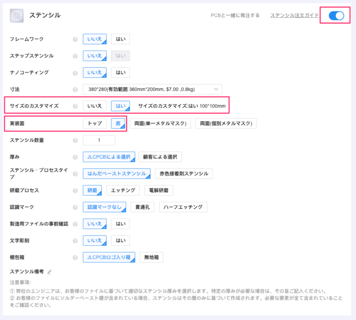 ステンシルも一緒に発注する場合、下にある[PCBと一緒に発注する]を選択します。