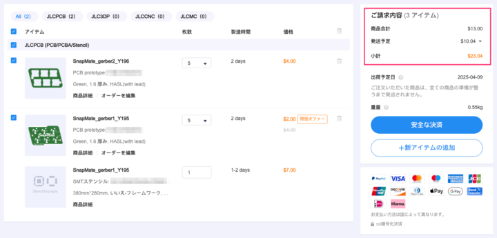 配送方法にOCS Expressを選択し、メイン基板・ステンシル・キープレートのトータルコストは約23ドルほどとなりました。