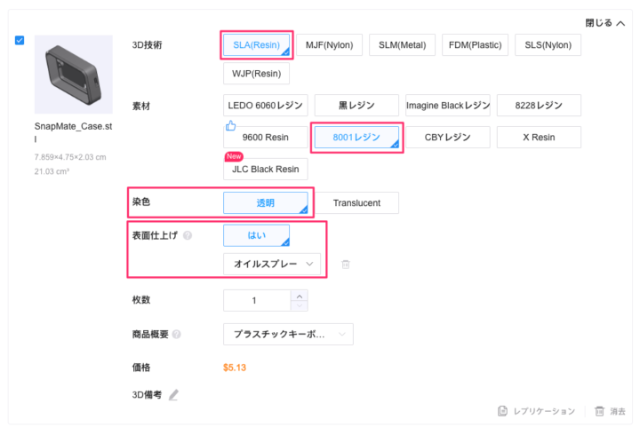 透明ケースはベースに[8001 レジン]を選択し、[表面仕上げ]に[オイルスプレー]を選択します。