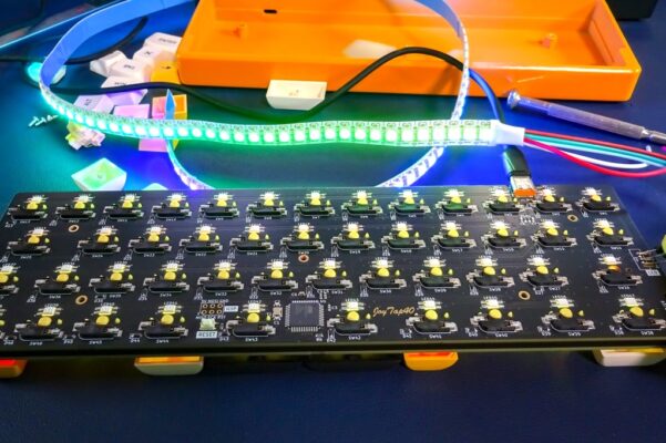 既存のマイコンボードを使わずオンボードRP2040で基板を設計する場合、ATmega32U4で組む場合と比べかなりパーツの数が増えてしまうので、キースイッチやLEDの穴が多い自作キーボードの基板ではパーツの配置や配線が大変になってくる事が多く感じます。