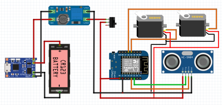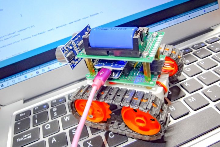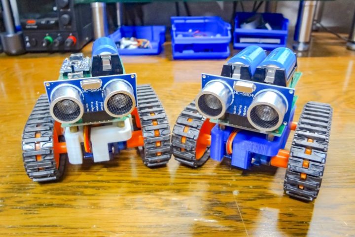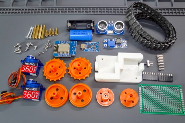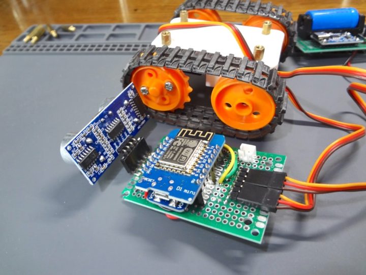 マイコンには小型なESP8266開発ボードのWeMos D1 Mini(Lolin)を使い2つのSG90サーボモーター(全回転タイプ)を制御するシンプルな構成で、障害物検知用に超音波センサー(HC-SR04)も使ったWi-Fi経由でスマホアプリなどから操作するMini Tankとなります。