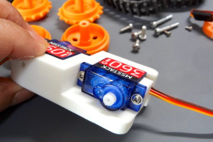 ギアボックスを使い3mmシャフトでホイールを固定して動かすものですが、3Dプリンタでマウントパーツを作成しこれをSG90サーボモーターで動かせるようにしています。