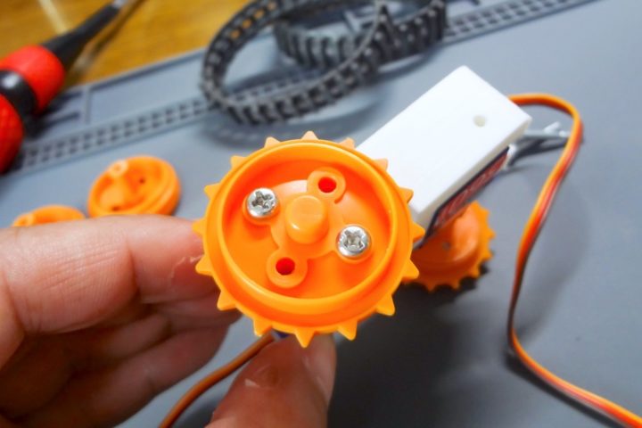 このホイール固定用パーツに「トラック&ホイールセット」に付属のスプロケットホイール(大)をM3×8mmビスで固定します。