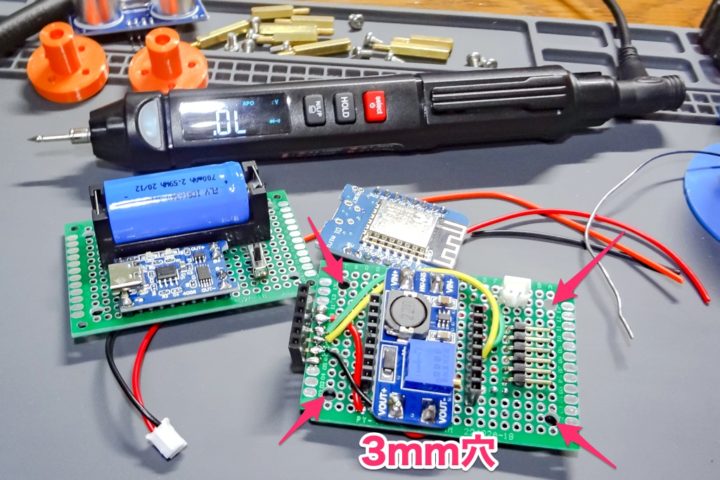 ユニバーサル基板の固定にいくつかM3ビスとスペーサーを使います。