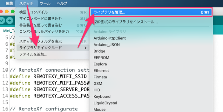 Arduino IDEの[スケッチ]→[ライブラリをインクルード]→[ライブラリを管理]へと進みます。