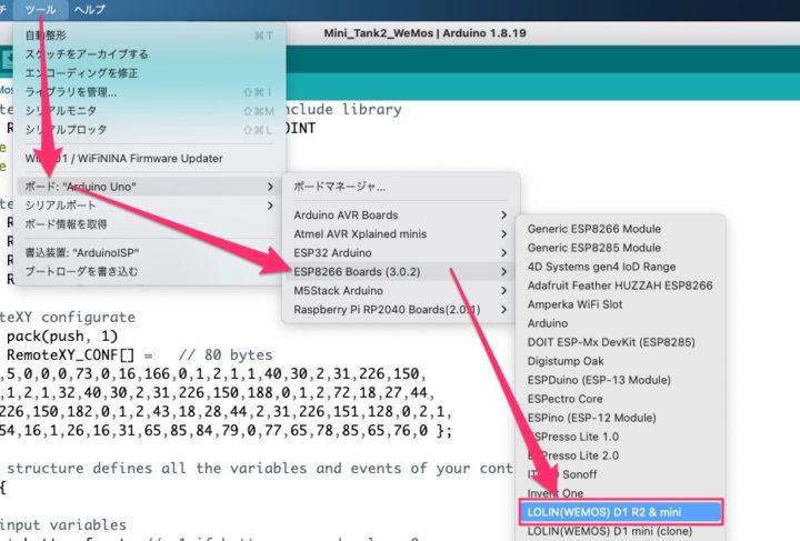 Arduino IDEの[ツール]→[ボード]→[ESP8266 Boards]から[LOLIN(WEMOS)D1 R2 & mini]を選択して下さい。
