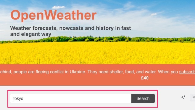 OpenWeatherのトップページの検索ボックスに地域を入力します。