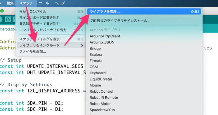 上記開発環境が整えば、ここから一部スケッチの修正作業と使用するライブラリのインストール作業を行っていきます。
