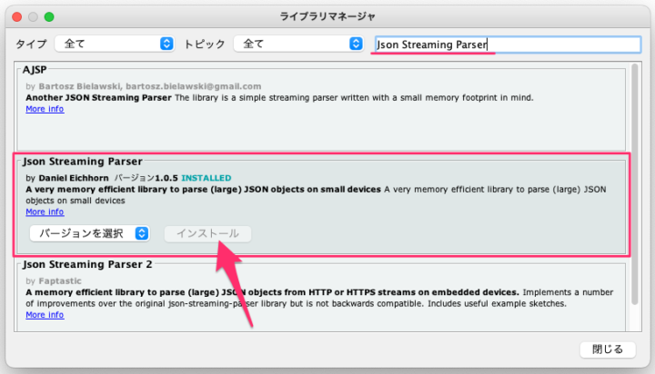[json streaming]で検索すると[Json Streaming Parser]というライブラリが見つかります。これをインストールします。