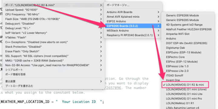 ボード設定は、[ツール]→[ボード]→[ESP8266 Boards]から[LOLIN(WEMOS)D1 R2 & mini]を選択します。